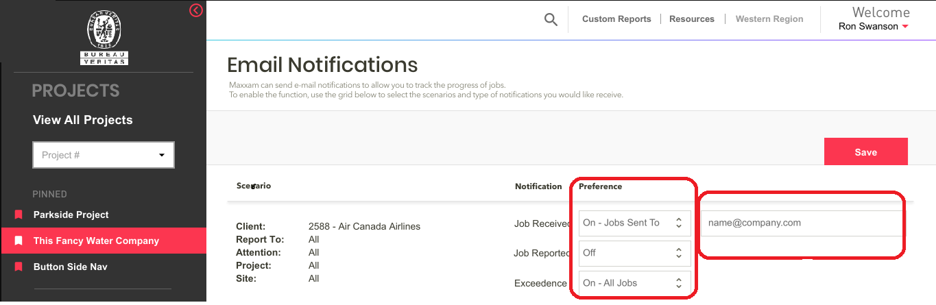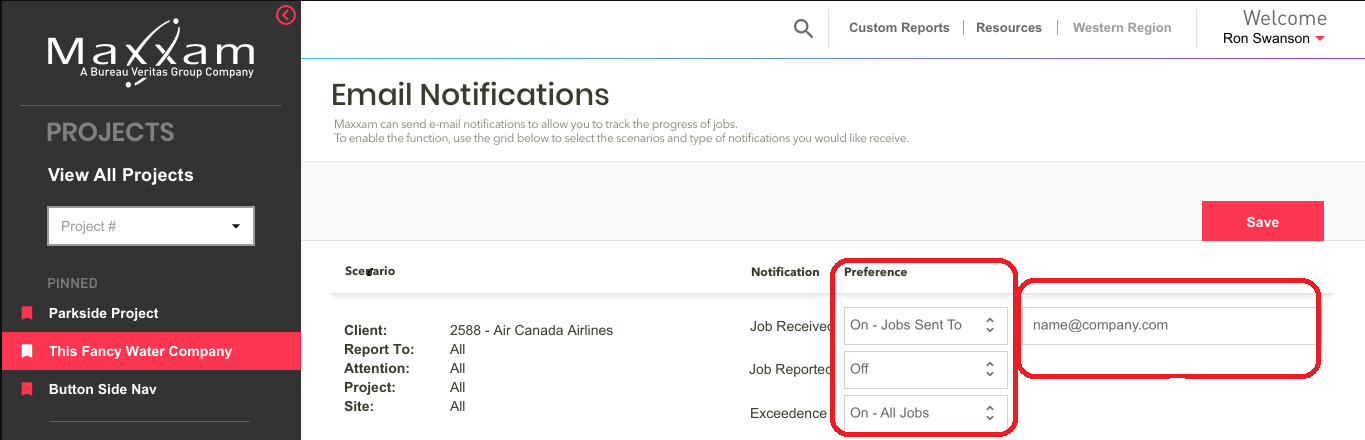 2. A list of all your reporting Scenarios will appear. There are three different notification options for each Scenario: Job Received, Job Reported and Exceedence.