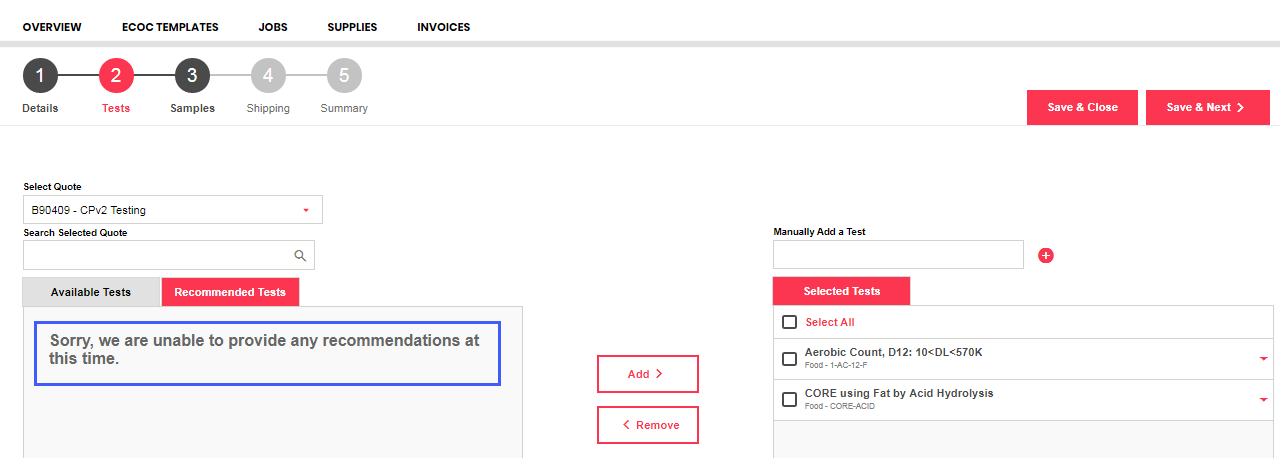 - Select a quote from the dropdown menu and click the Recommended Tests tab. This will yield suggestions based on the selected quote.