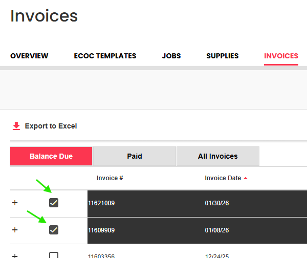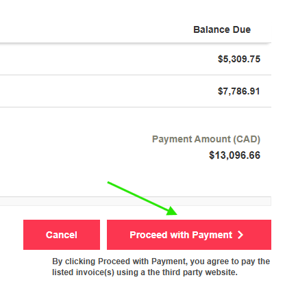 2. Select one or multiple invoices using the check boxes to the left. If you are paying a single invoice you can either use the inline menu and click the "Pay Invoice" icon, or if you have selected multiple invoices use the red "Pay Invoices" button in the upper right hand section of the page. This will take you to a payment summary page, which will show you the total amount to be paid.