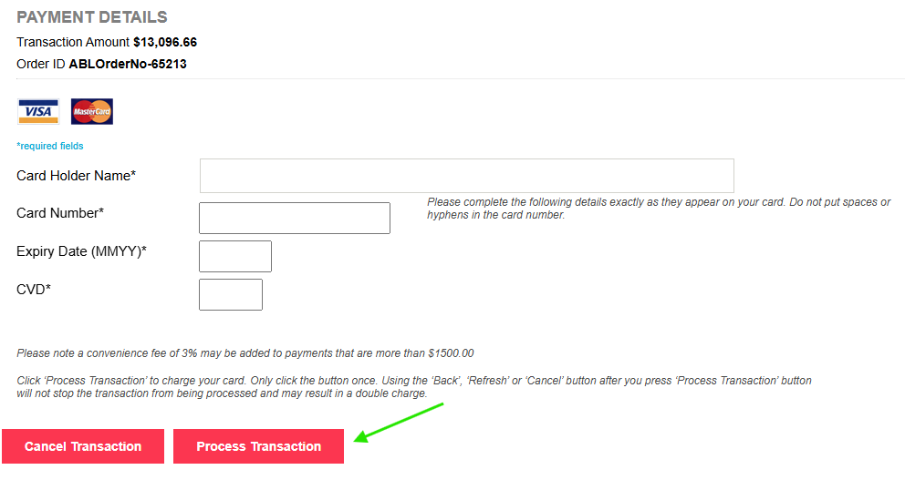 3. Click "Proceed with Payment" and enter payment details. Once you have entered your details click " Process transaction" to finish your transaction.