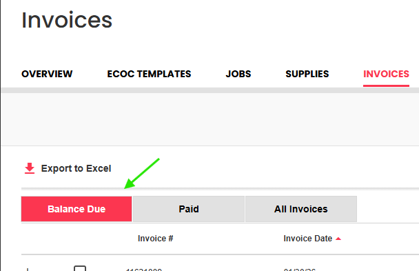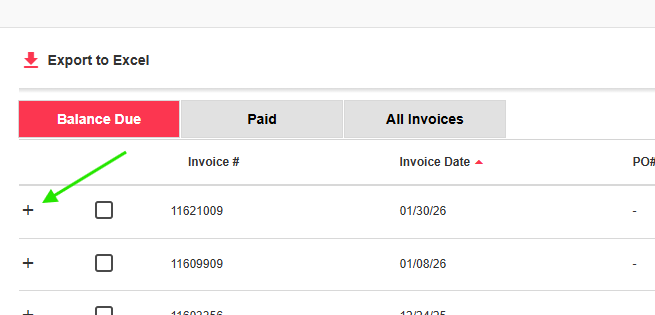 A spreadsheet of detailed invoice information can be downloaded using the "Export to Excel" button. Make sure you have the correct view (Balance Due, Paid or All invoices) open, as that is the list of invoices that will be included.