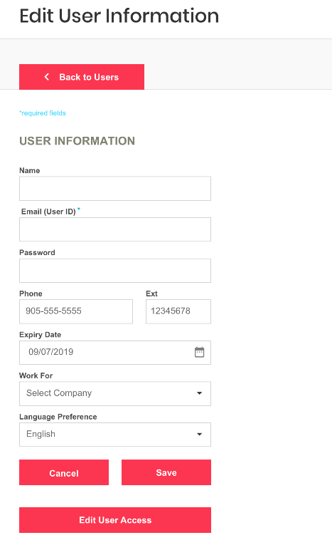 2. In the "User Information" section fill in the fields: First Name, Last name, Email, Password, Phone and Company. Also, be sure to check the password expiry date. Click "Save".